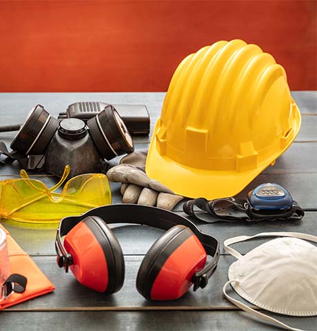 Safety Coverall, Safety Shoes, Helmet, Goggles, Gloves, Ear Plugs